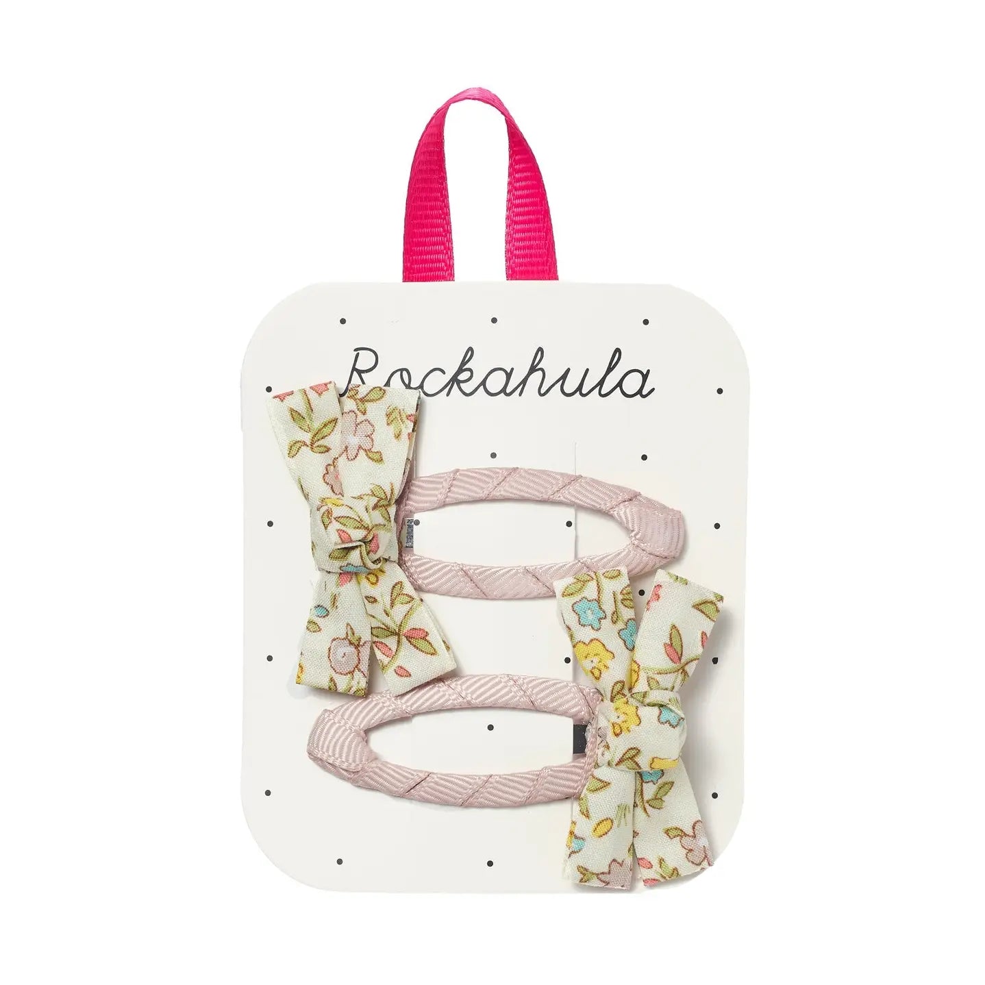A blooming set of two hand-tied bows made from our petal floral fabric. Both are set on two dusky grosgrain ribbon wrapped snap clips.