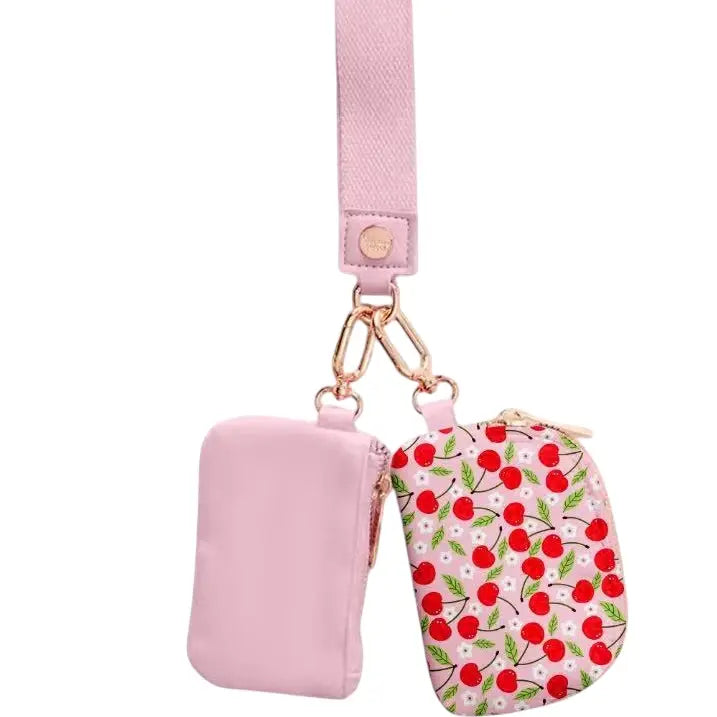 Carry your keys, cards, and cash in a cute trendy style! Two wallets for all your necessities on a soft wristlet handle. Gold hardware makes these fancy and fun! Wallets measure 4.5" x 3".