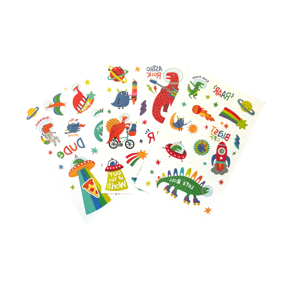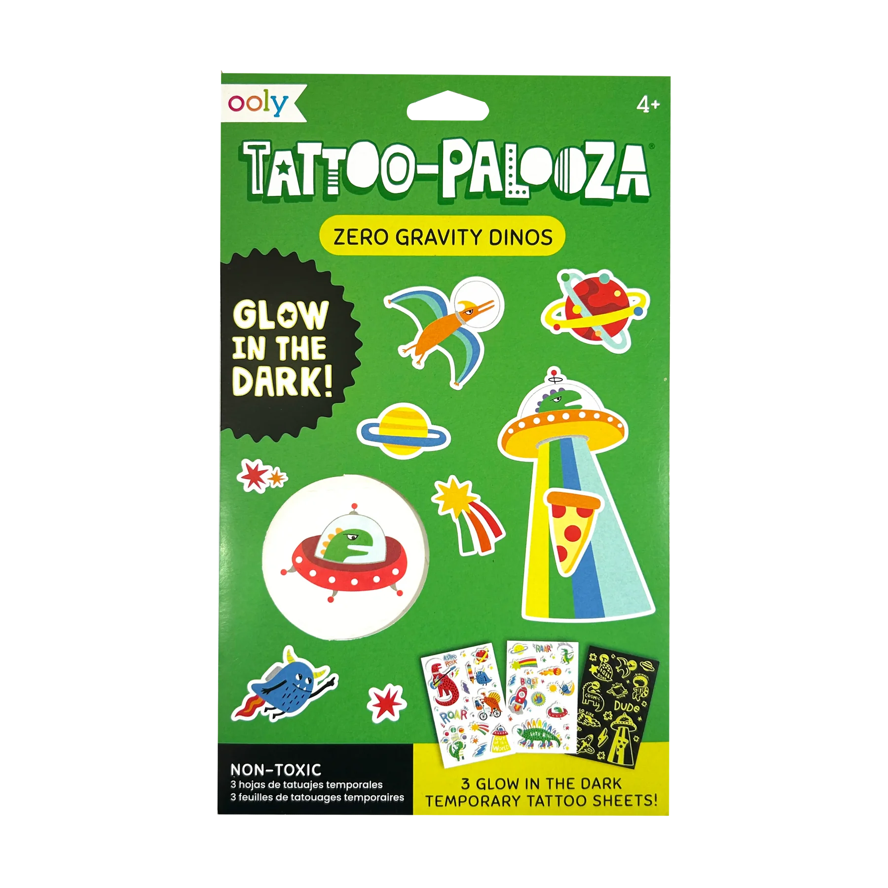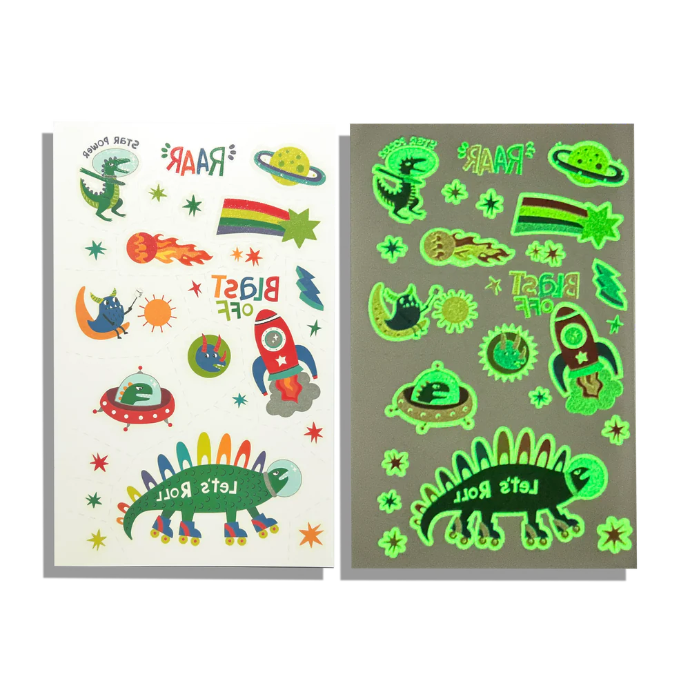 Blast off into fun with the Tattoo-Palooza Glow in the Dark Temporary Tattoos - Zero Gravity Dinos! This set of 3 tattoo sheets features temporary tattoos combining dinosaurs and space adventures that glow in the dark for an out-of-this-world experience. From astronaut T-Rexes to floating triceratops, these kids' temporary tattoos add a prehistoric twist to cosmic fun