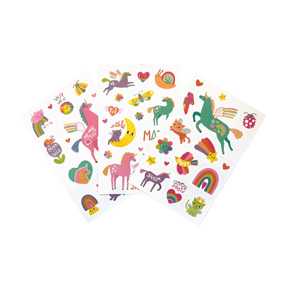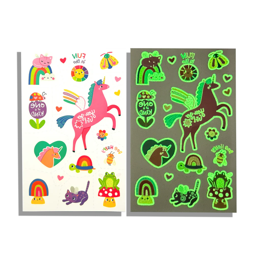 Make playtime magical with the Tattoo-Palooza Glow in the Dark Temporary Tattoos - Magic Moonbeams! This set of 3 tattoo sheets features temporary tattoos with whimsical designs like unicorns, stars, and crescent moons that glow in the dark.