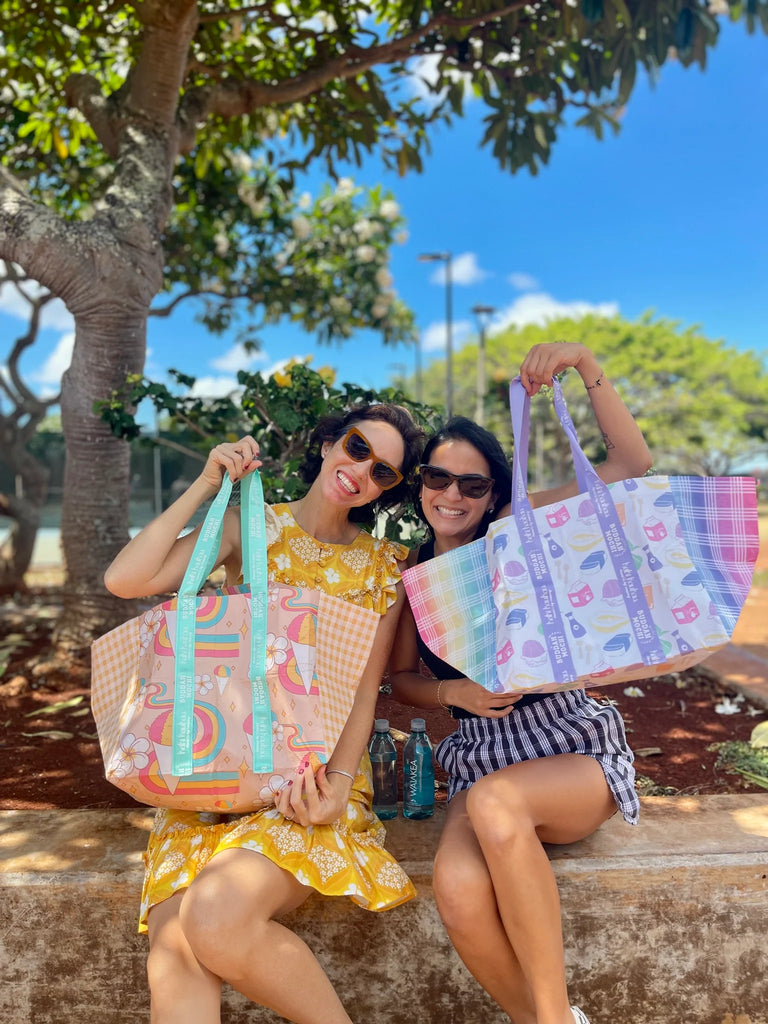 Introducing the Market Tote - quite possibly the happiest bag you've ever seen! Our latest style is slightly smaller than the Bombucha bag, but still roomy enough for shopping hauls and family excursions. The 15x12" flat base works great for pastry boxes and other flat items that you don't want tipping over. Best of all, it's made from water-resistant, double-layer rPET - keeping water bottles out of the landfill!