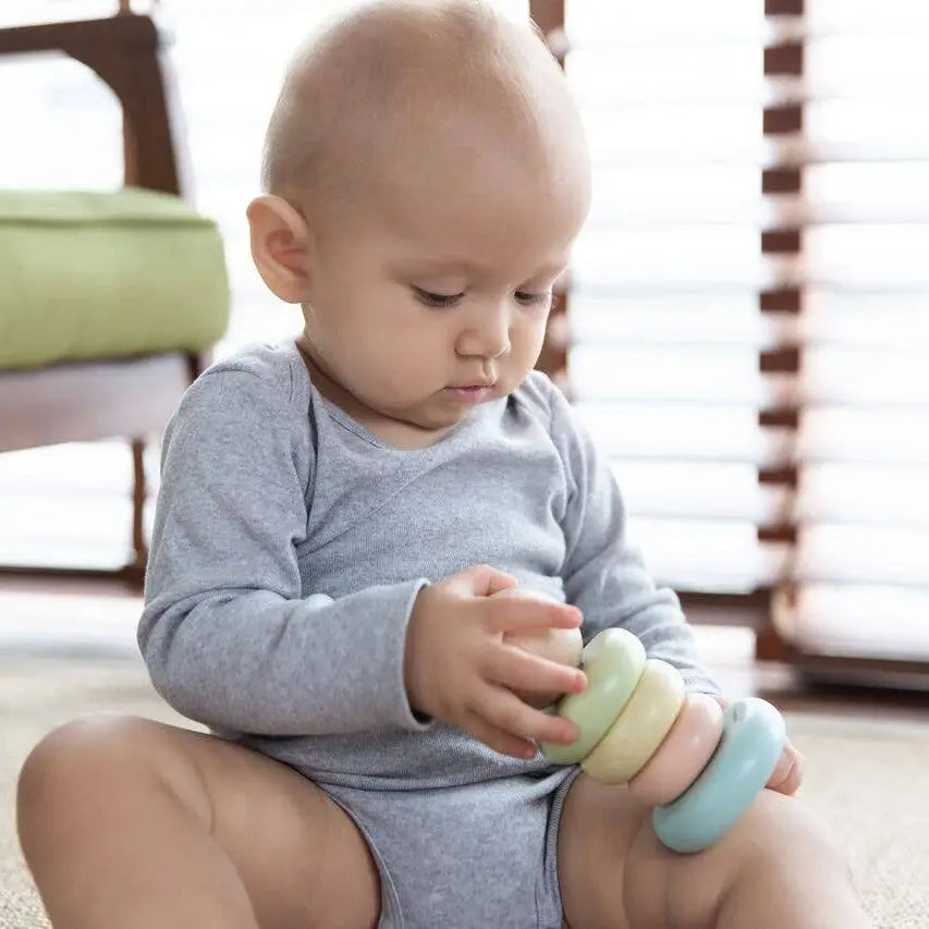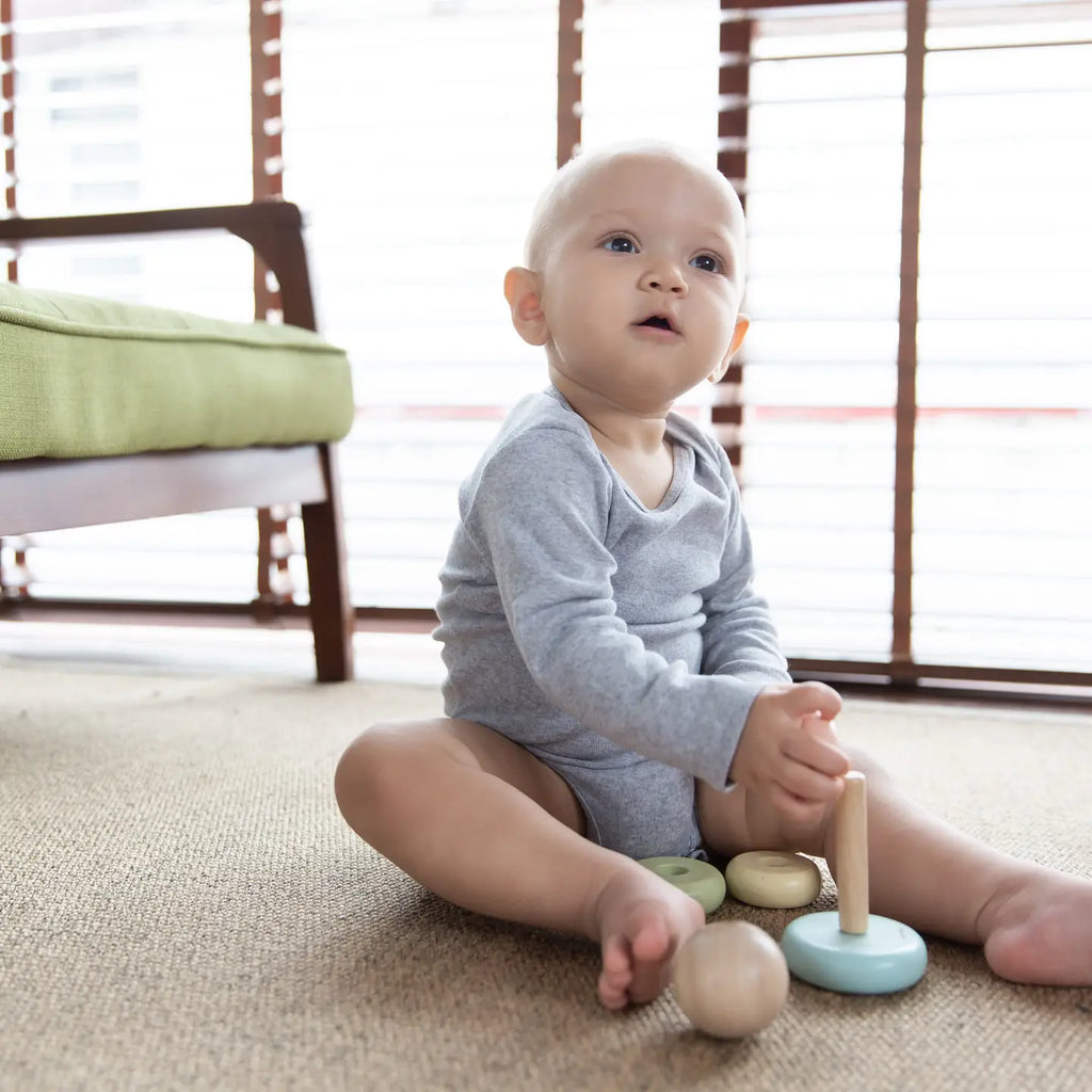 Start learning about size and order with the PlanToys First Stacking Ring. Available in a pastel version or a modern rustic colorway. Children will be able to stack the rings over and over again in the pattern of their choice as they develop foundational fine motor skill through play. For your child's safety and storage purposes, the center rod is foldable.