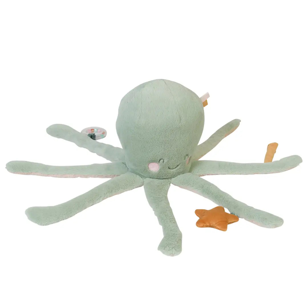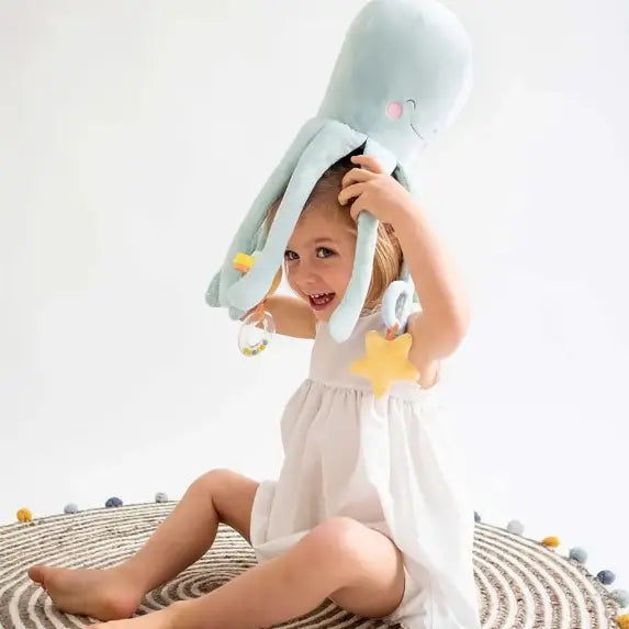 Your little one will discover mirrors, crunchy paper, different textures and various rattles with this soft fluffy multi-activity octopus friend in mint.