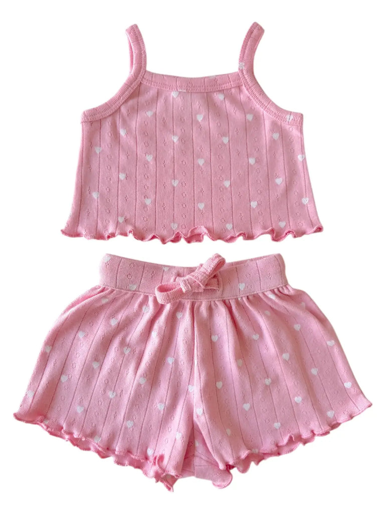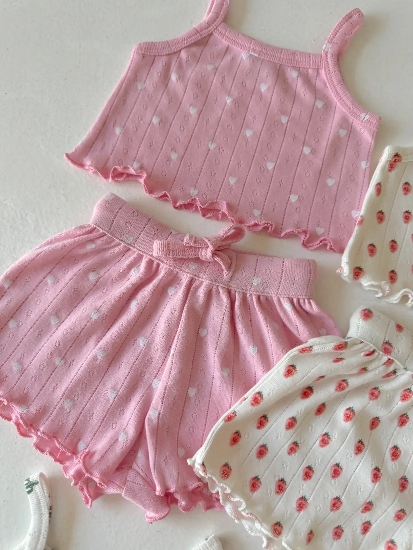 The summer set includes a cropped tank and drawstring shorts with ruffle hem.