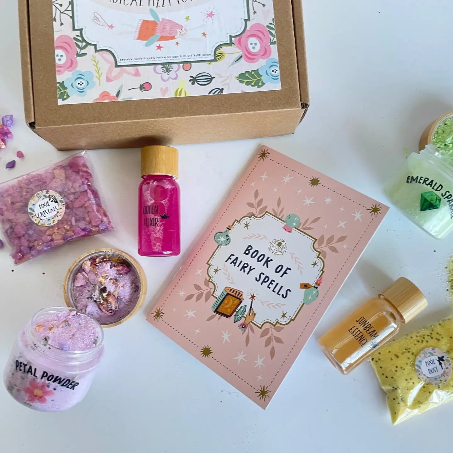 The Fairy World has chosen your child to receive six magical ingredients to create three fizzy, shimmering potions. With a Spellbook in hand, kids follow simple recipes and recite rhyming spells that celebrate Inner Beauty, Creativity, and the ability to Talk to Nature. But this kit is more than just potions—it’s an adventure. Before mixing, little potion-makers are invited to gather nature’s treasures—leaves, rocks, or petals—to complete their spells. Along the way, they’ll discover that true magic comes from within. Kids can also write their own spells and save potions as reminders of their inner powers. Made with plant-based bioglitter and reusable PET plastic containers, every ingredient is safe for kids and gentle on the Earth.