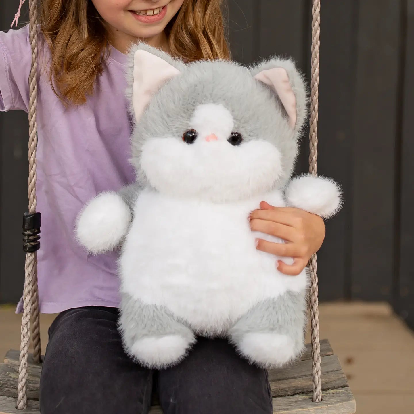The Chunka Dunkas Kitty combines ultra-soft dual-tone plush in charcoal grey with contrasting white belly and face, irresistibly round body perfect for squeezing, sculpted-in eyes that create gentle sleepy expression, and those chubby cheeks everyone wants to pinch.