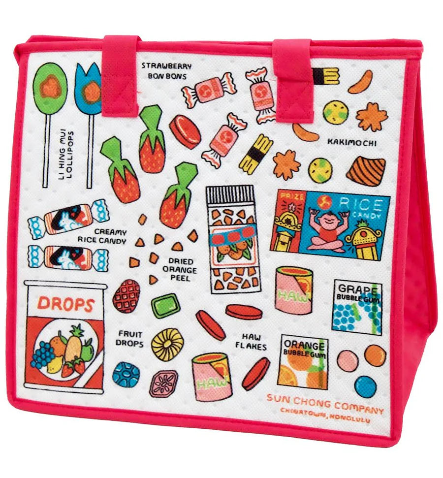 Local Kine Snacks print by Kelsie Dayna. Insulated cooler bag with zipper top and tote handles.